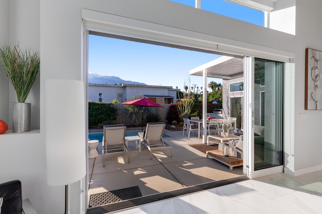Volume ceilings give this home a light and open feel in the great room, expansive bedrooms, and generous walk-in closets. The open floor plan, wood tile floors throughout the living area, gas fireplace, private pool and deck, and many upscale appointments make it an environment that begs to be enjoyed and shared with friends and family. The property takes advantage of modern innovations with energy-efficient appliances, top-grade wall and ceiling insulation, an energy-efficient pool, and the use of eco-friendly materials and techniques. You’ll love the outside oasis of this Palm Springs vacation home, as the sparkling pool and spa invite you to enjoy the reliable year-round sunshine and breathtaking mountain views while you relax on a lounge chair or pool float. Additional outside amenities include two misting rock features on the west side of the pool, a mobile standing mister, and a remote-controlled awning system with built-in misters to help cool off on those extra hot days. Or kick back on the luxurious outdoor leather couch for a great place to have your morning coffee as the sun rises against the mountains.